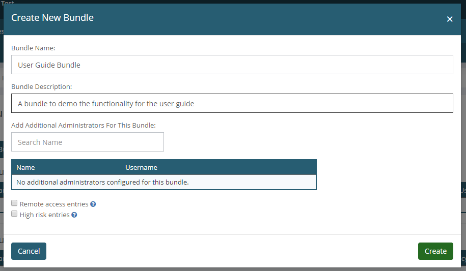 •Bundle Name •Bundle Description •Whether or not you want to optionally add administrators to the bundle. •Whether you intend to add remote access or high risk entries into the bundle.